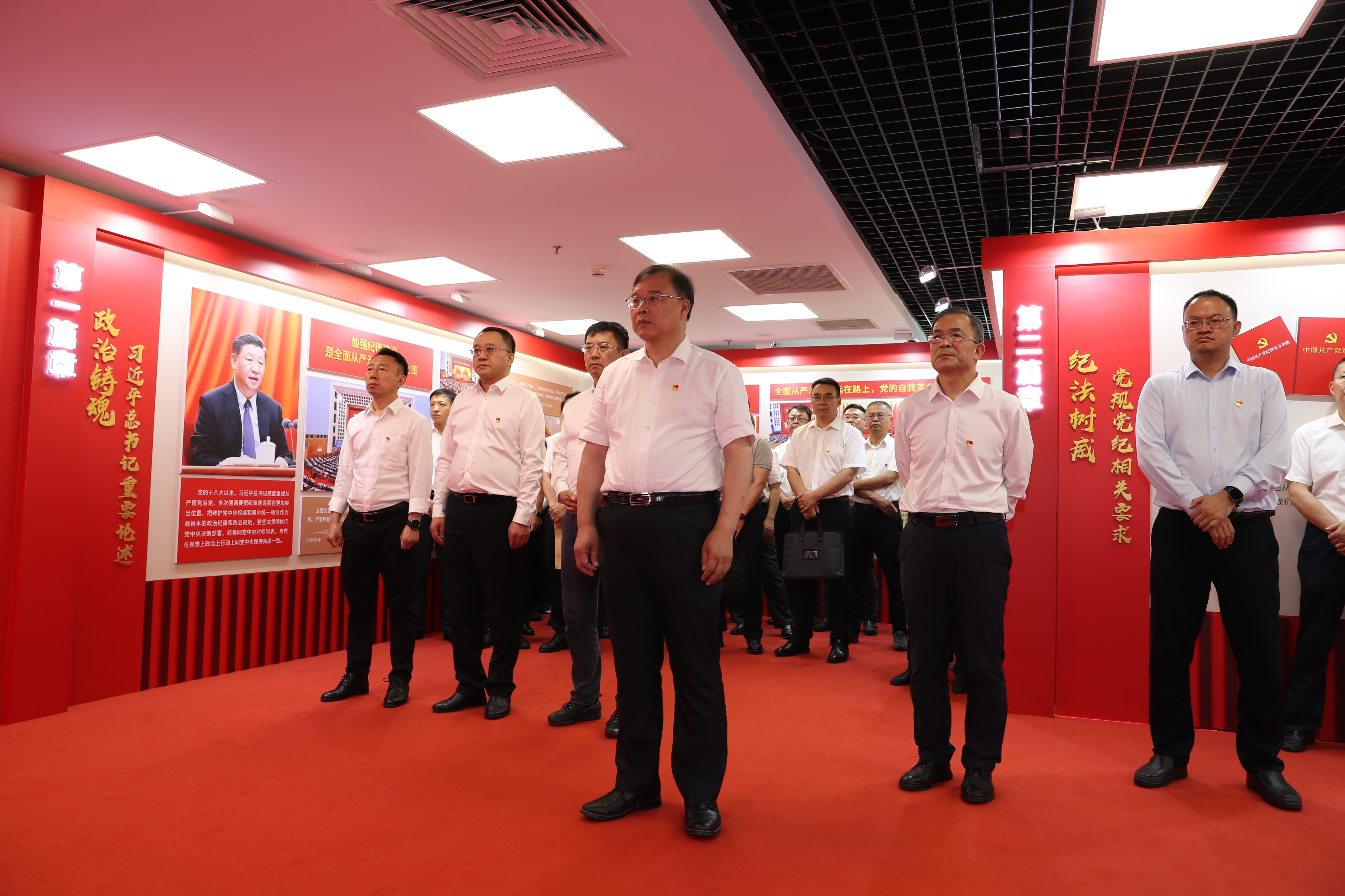 为深入学习贯彻习近平总书记关于全面加强党的纪律建设的重要论述,推动党纪学习教育取得扎实成效,6月14日,中国有色集团党委组织参观国务院国资委党委“守纪铸忠诚 担当建新功”党纪学习教育展,深入开展理想信念教育、党纪国法教育、案例警示教育。集团公司党委书记、董事长奚正平,党委副书记、总经理张晋军,集团公司领导班子成员,集团总部各部门、在京出资企业主要负责人及有关党员代表集体参观展览。