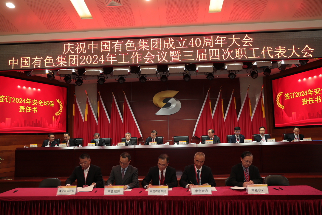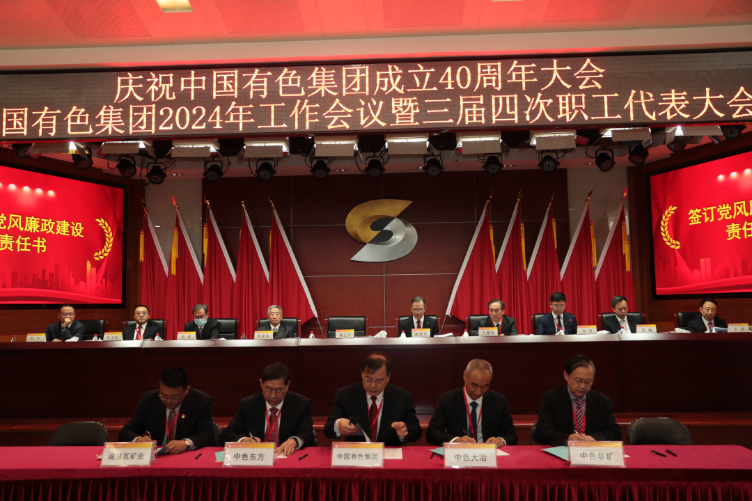 会议还签订了出资企业经营业绩、安全环保、党风廉政建设责任书,进行了交流发言,发布了《中国有色集团贯彻落实习近平总书记三次重要指示批示精神行动方案(2024年版)》《中国有色矿业集团有限公司40周年科技成果纪念册》,通过了《中国有色矿业集团有限公司三届四次职工代表大会决议》。