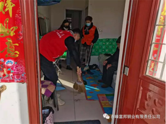 中色沈矿富邦铜业青年志愿者对孤寡老人的住所进行清扫
