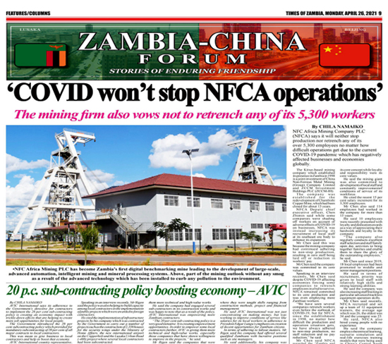 4月26日,赞比亚影响力最大的主流媒体赞比亚时报在“赞中友谊论坛”头条位置,再次讲述了中国有色集团出资企业中色非洲矿业公司(简称:中色非矿)故事——“疫情下,中色非矿不会裁减任何一个赞比亚员工”。同期财税专版,还刊载了中色非矿自成立以来累计缴纳税收达2亿美元,用行动践行“中赞合作、共同发展”理念,积极支持赞比亚经济发展的专题报道。