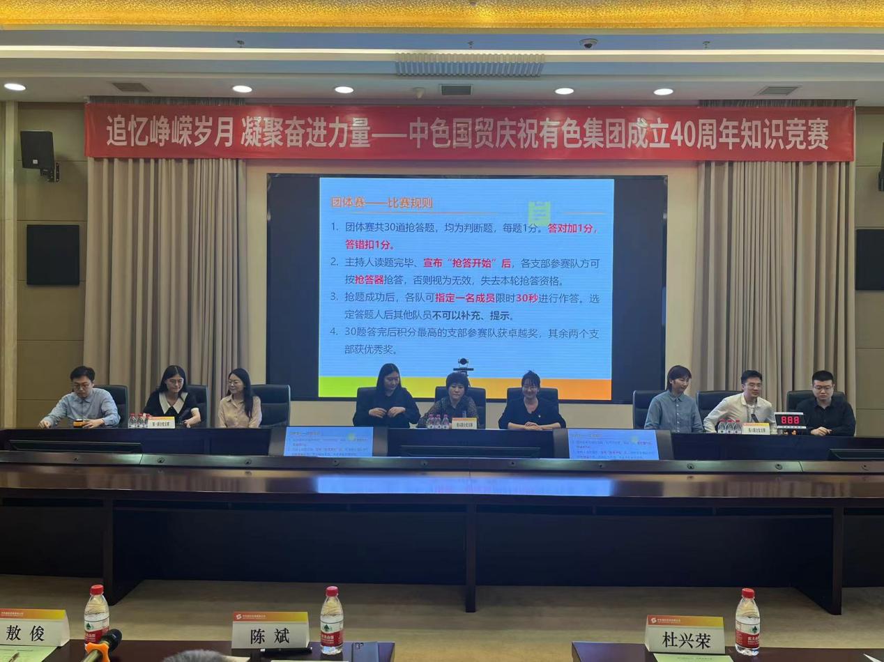 9月27日,为庆祝集团公司成立40周年,结合深入开展学习贯彻习近平新时代中国特色社会主义思想主题教育,中国有色集团出资企业中色国际贸易有限公司(简称:中色国贸)举行“追忆峥嵘岁月、凝聚奋进力量”主题知识竞赛活动,通过组织党建知识、集团历史、公司历史竞赛,夯实坚定拥护“两个确立”、坚决做到“两个维护”的思想根基,追忆集团公司四十年栉风沐雨、筚路蓝缕的创业历程,树牢公司党员新时代积极上进、实干兴企的干事意识。