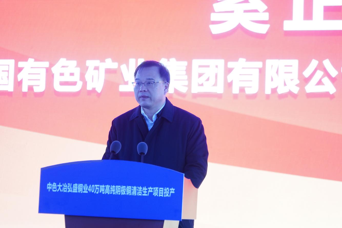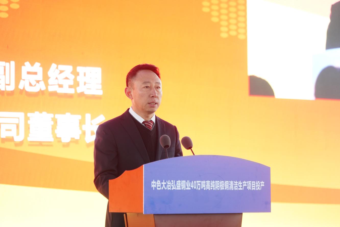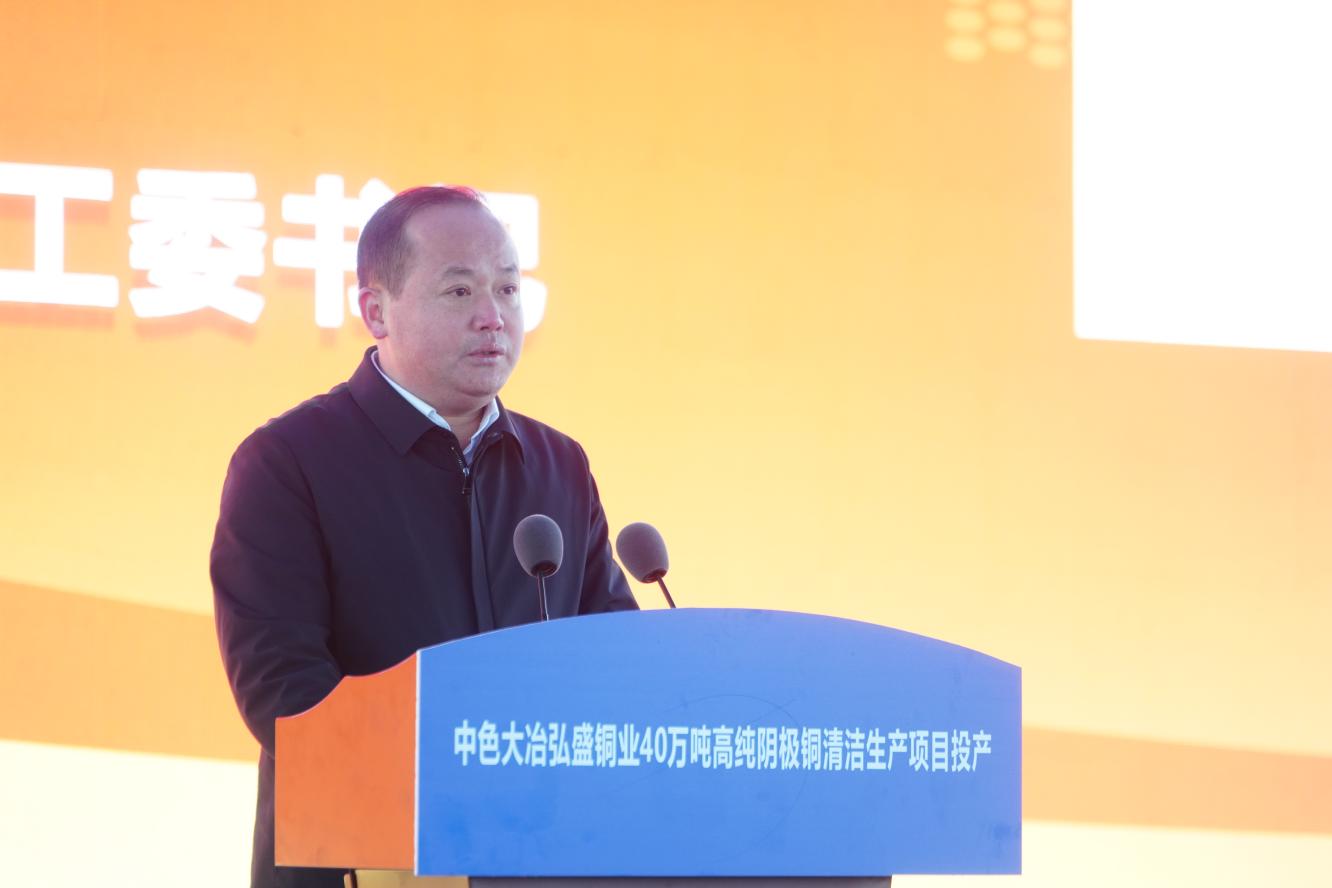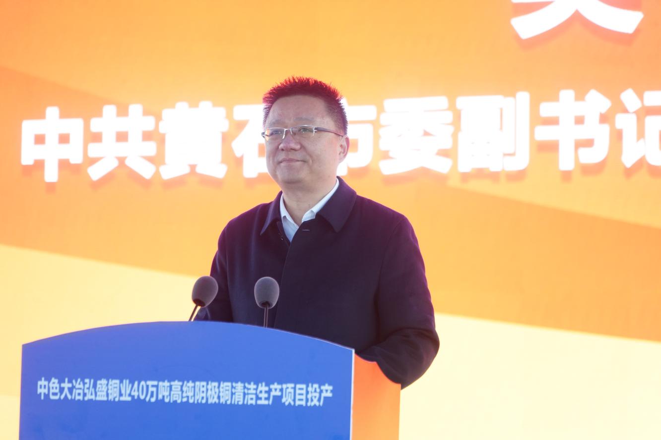 奚正平代表中国有色集团向黄石市委市政府和合作伙伴给予中国有色集团和中色大冶的关心和支持表示衷心感谢。他表示,弘盛铜业40万吨高纯阴极铜清洁生产项目正式投产,吹响了迈向铜产业第一方阵的前进号角。中色大冶要接续奋斗、砥砺奋进,以安全生产为前提、强化管理为基础、改革创新为抓手,早日实现满负荷正常运营,全面夺取项目达产达标的新胜利;要立足最佳、做强做优,发挥头雁效应、对标世界先进,着力打造世界先进水平的铜冶炼项目新标杆;要不忘初心、牢记使命,以绿色高质量发展彰显央企的责任担当。