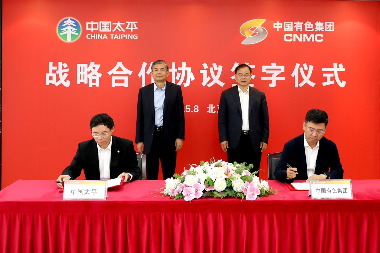 5月8日,中国有色集团与中国太平保险集团有限责任公司(以下简称“中国太平”)战略合作协议签约仪式在中国有色大厦举行。中国有色集团党委书记、董事长奚正平和中国太平党委书记、董事长王思东现场见证签约,中国有色集团总经理张晋军主持签约仪式,总会计师安宜与中国太平副总经理朱捷分别代表双方在协议上签字。