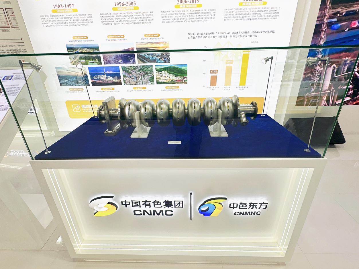 在产品展区,对集团所属企业拥有独立注册商标品牌的产品进行了实物展示,包括中色东方的7cell超导腔、钽铌产品、铍及铍合金产品、银产品、钛及钛合金、钒铝合金产品,中色桂林院的纳米硅粉、硅基负极材料、KTP电光开关、KTP倍频器件、水热法PPKTP器件、金刚石组合绳锯、超硬合金刀等产品,中色大冶的阴极铜板、金银锭产品,中色股份的锌锭、锌合金产品等一系列行业“拳头”产品,均在相应区域展柜集中展示。