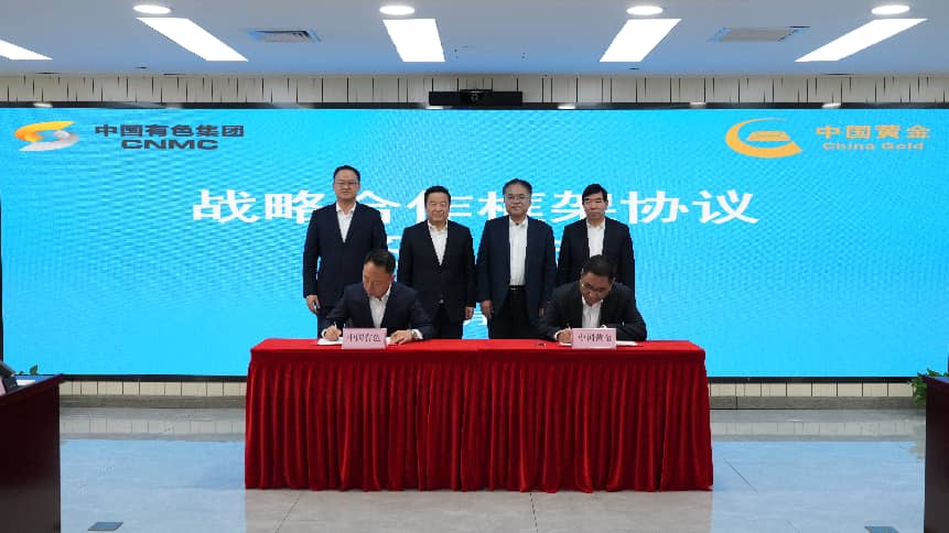 2月10日,中国有色矿业集团有限公司(简称:中国有色集团)与中国黄金集团有限公司(简称:中国黄金集团)签署全面深化战略合作框架协议。中国黄金集团党委书记、董事长周洲,中国有色集团党委书记、董事长文岗,党委委员、副总经理刘宇,中国黄金集团建设有限公司党委书记、董事长高延龙现场见证签约。中国黄金集团副总经理王佐满,中国有色集团党委委员、副总经理王焱代表双方签约。