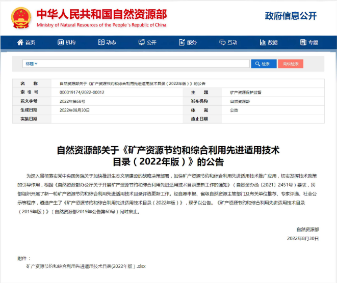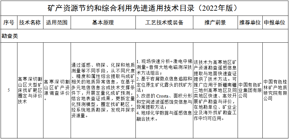 2022年8月30日,自然资源部关于《矿产资源节约和综合利用先进适用技术目录(2022年版)》正式公告,由中国有色矿业集团有限公司推荐,中色桂林院主持负责、中国科学院空天信息创新研究院及新疆维吾尔自治区地质矿产勘查开发局地球物理化学探矿大队参与共同完成的“十二五”国家科技支撑计划课题(2015BAB05B05)“高寒深切割山区大型矿床找矿靶区圈定与评价技术”成功入选。