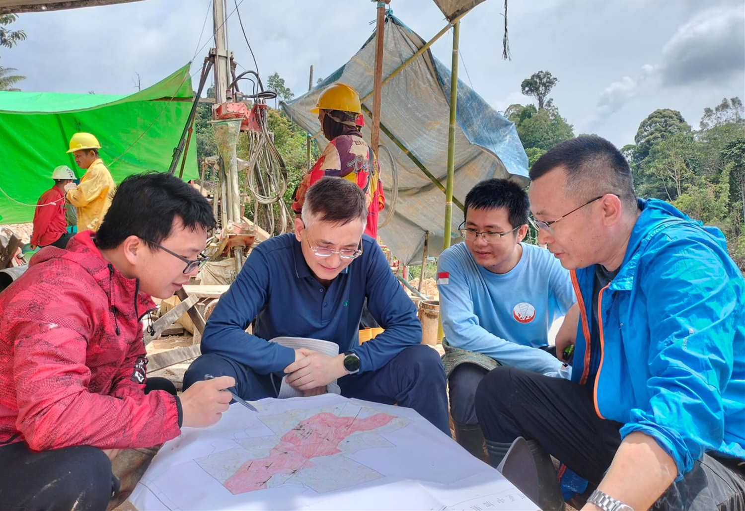 4月9日,朱景和董事长一行驱车5小时前往印尼金山金矿项目对项目组成员进行了慰问,仔细询问了解钻探进度、见矿成果、安全生产等情况,并与项目技术人员亲切交流,与业主方就矿山下一步勘查、合作进行了深入探讨。